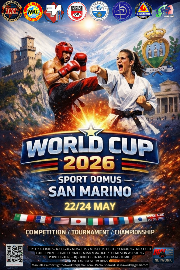 We are proud and honored to invite you to the 14th edition of Iaksa World Cup in Cooperation with Fight Net and WKL that will take place from May 22th to may 24th 2025, in San Marino (north Italy). The location is the prestigious sport hall Pala Domus Multi Eventi.